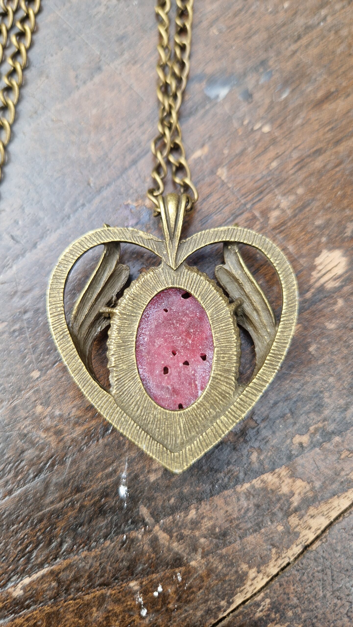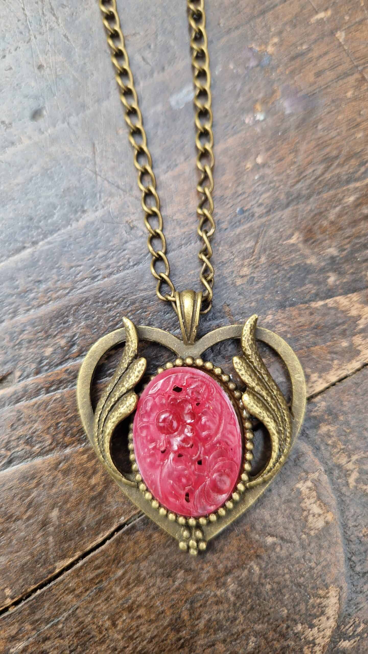 Mooie lange ketting van messing. Jugendstil hanger met een zee-glas caboucon uit de jaren 60. met de handgesneden uit Engeland.