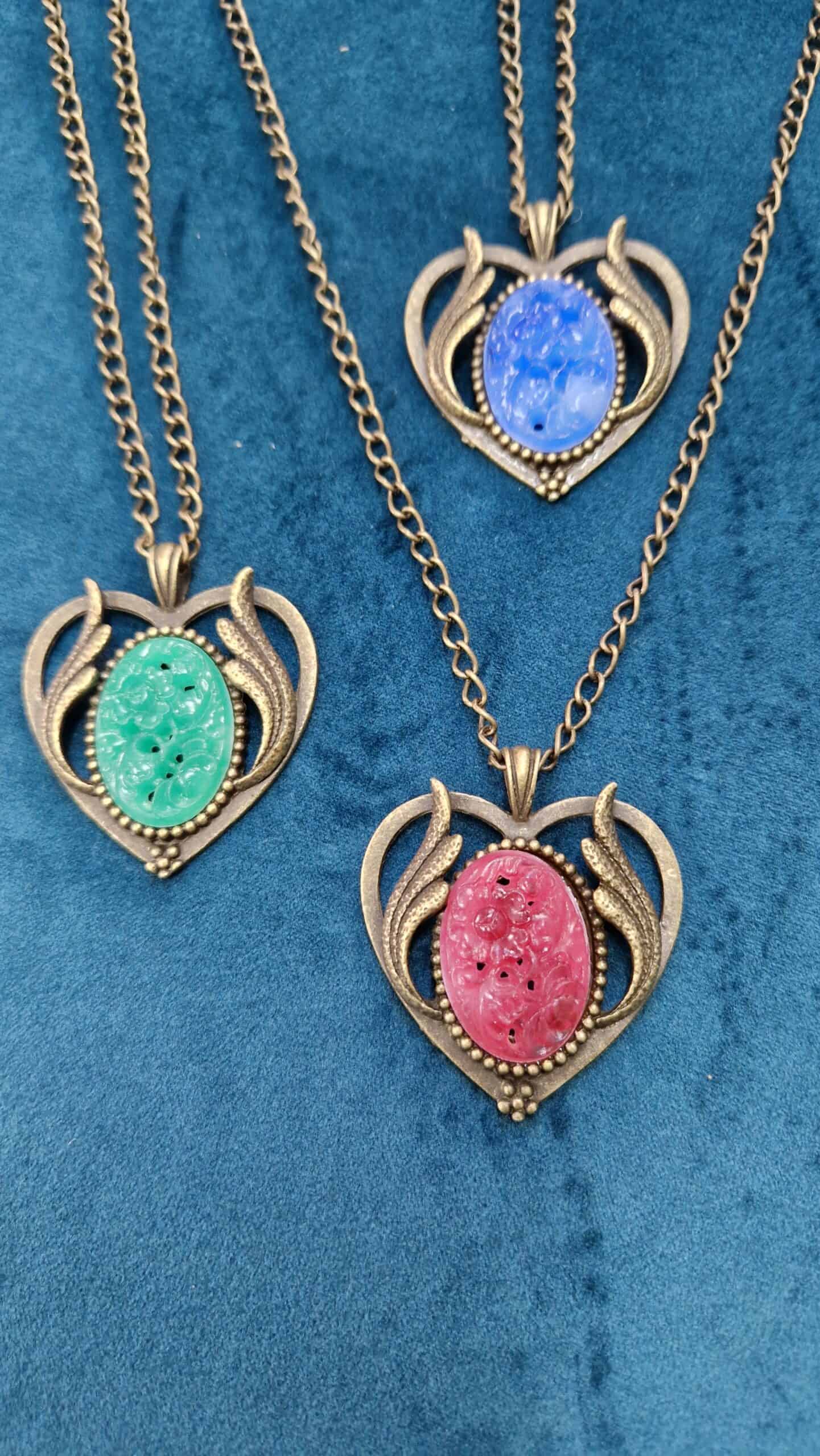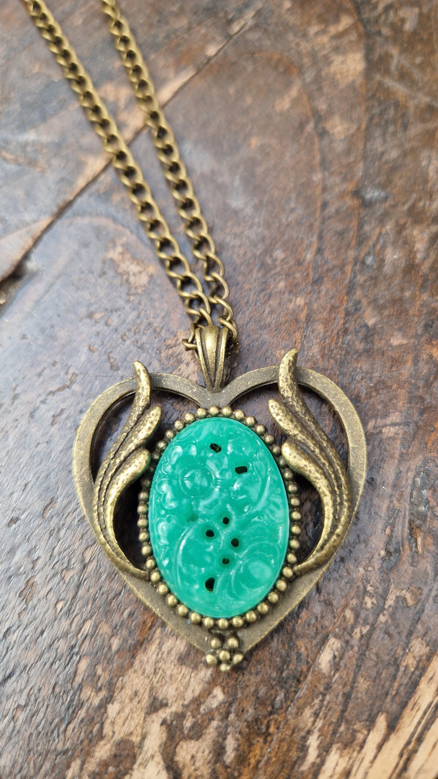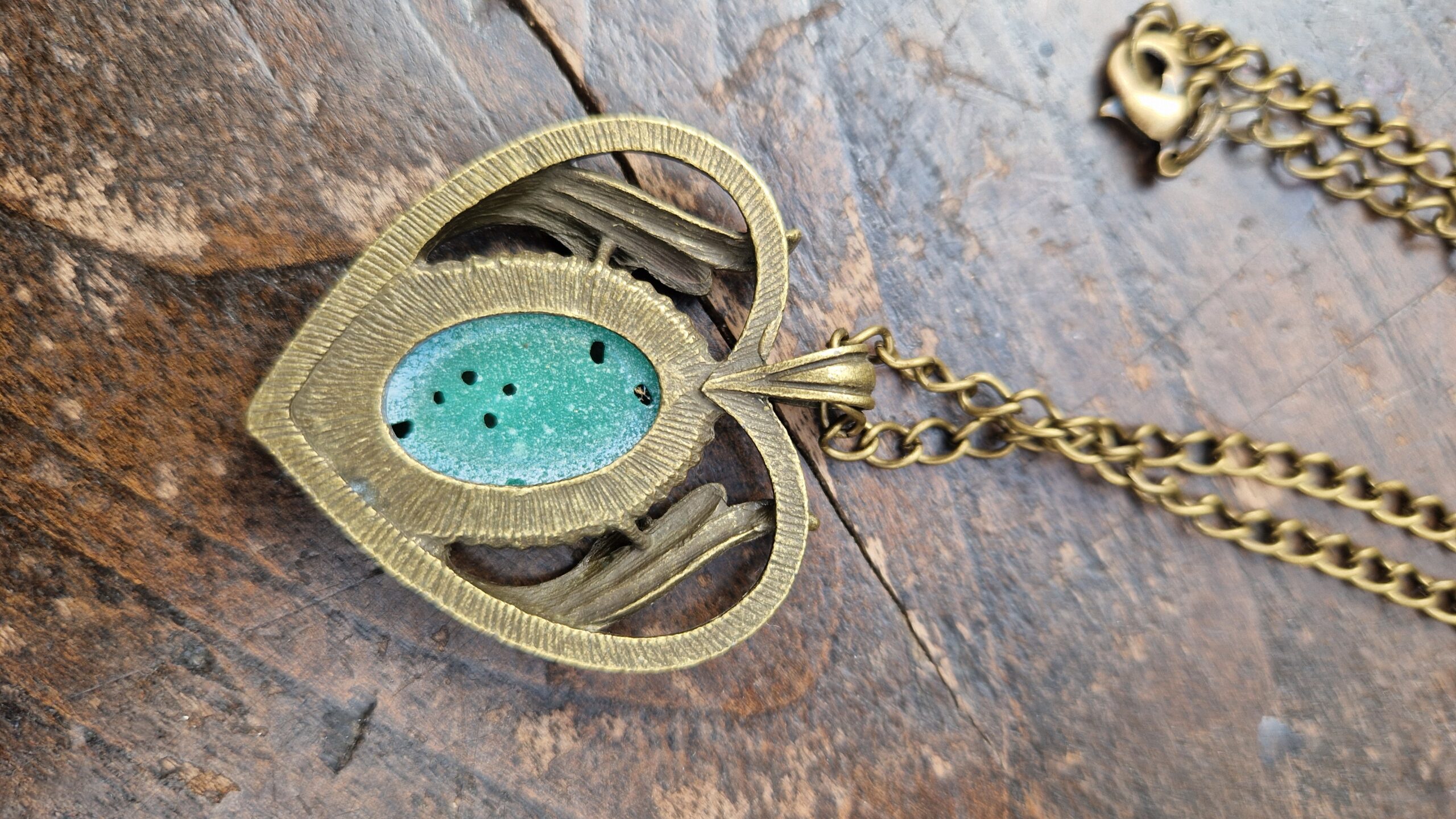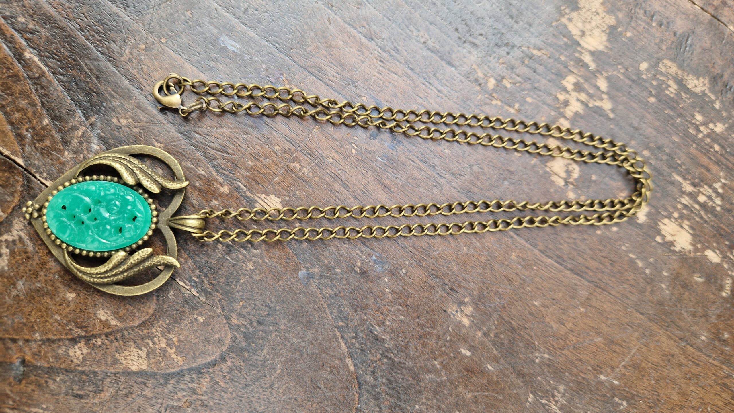 Handgemaakte messing ketting met mooie Jugenstil hanger, gevuld met handgesneden zee glas uit Engeland jaren 60.